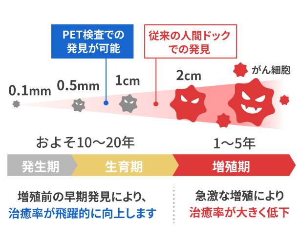 今までのがん検査では一般的に15ミリ程度のものしか発見できませんでしたが、PET検査では10ミリ以下の小さなものまで発見することが可能です。